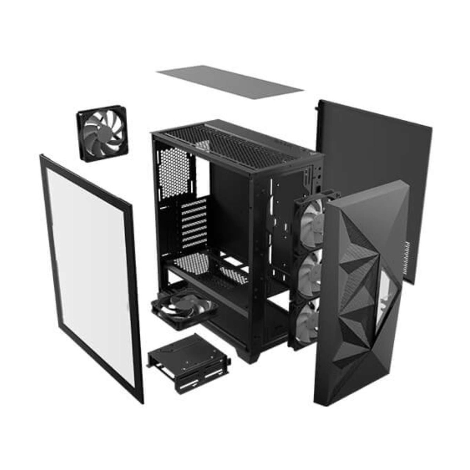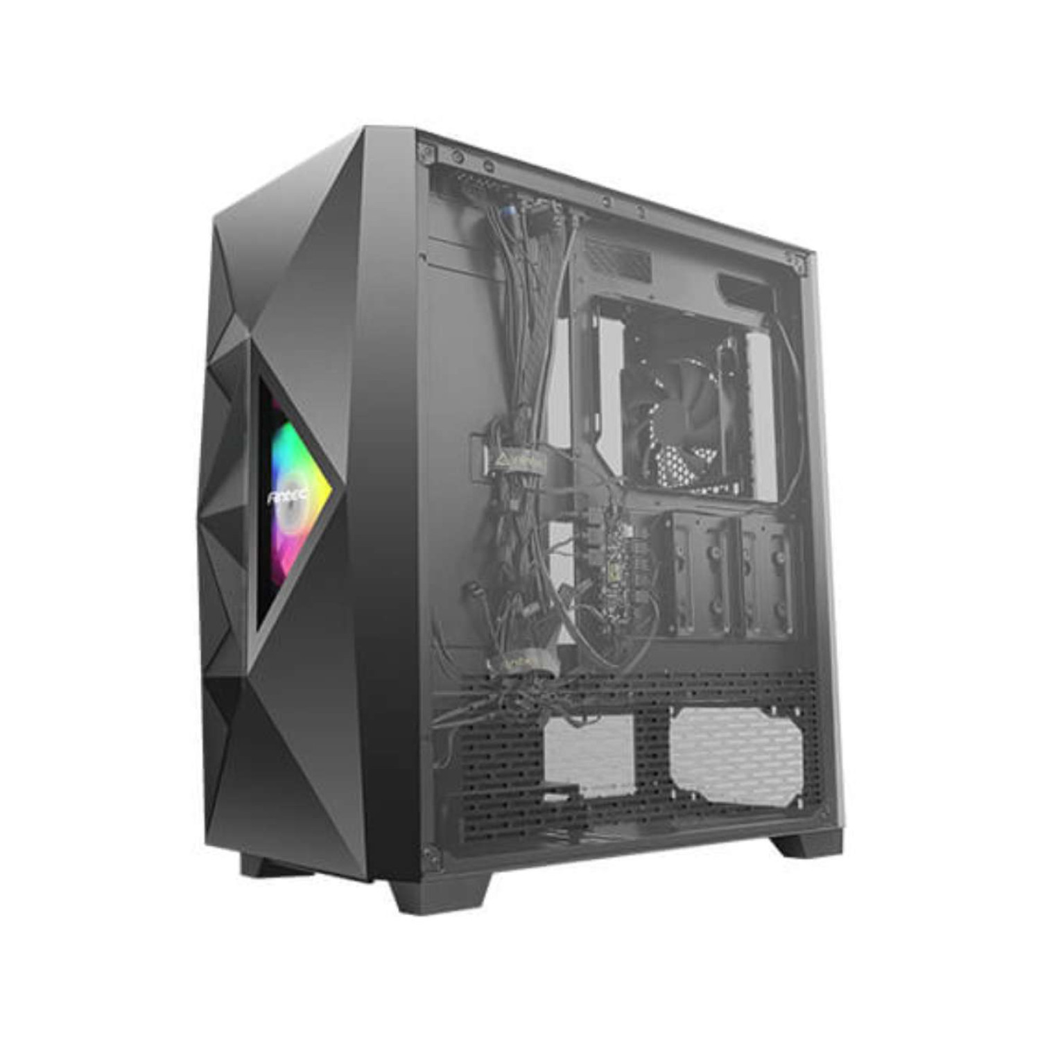 The case showcases a stunning geometric mesh front panel combined with mirror surface accents, creating a bold and modern gaming aesthetic. The 4mm tempered glass side panel allows users to display their gaming components and ARGB lighting in style.