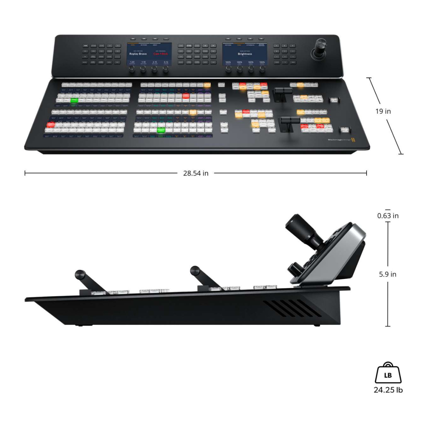 Equipped with 2 Mix Effects (M/E) rows, the panel offers 20 direct cross points and 40 shifted cross points. The tri-color LED crosspoint buttons provide clear visual feedback, and each is accompanied by a label with six rows of 24-character LCD displays. The unit features 8 on-air indicators and no dedicated power status indicators. For downstream keyer (DSK) control, there are 4 dedicated selectors for Auto, Cut, and Tie/Preview transitions. Additionally, it provides 2 preview transition buttons and transition rate displays via the main menu. Operators benefit from 2 LCD menu displays, each controlled by 20 buttons, along with 2 sets of 20 dedicated macro buttons for quick recall of complex commands. The panel also includes 8 transport control buttons, dual destination buses, dual source select buses, 2 smooth fader bars, a single 3-axis joystick, and a numeric keypad for precision control.