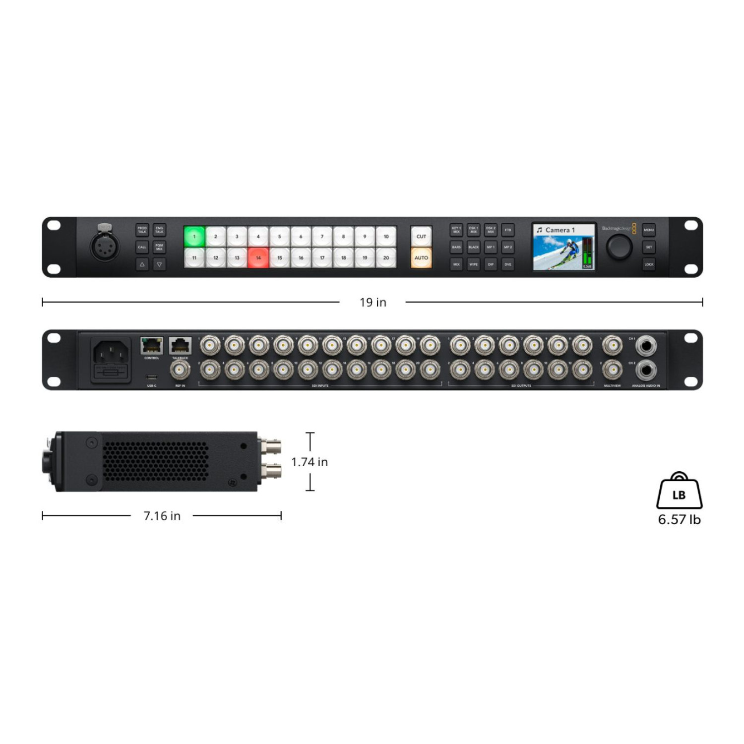 On the front panel, the switcher is equipped with a 2.2-inch LCD monitor, 22 LED setup buttons, 8 source buttons, 4 transition buttons, 6 talkback buttons, a control knob, and a front panel lock.