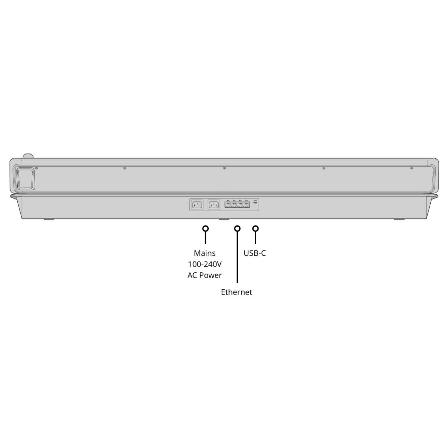 The ATEM 4 M/E Advanced Panel 40 is equipped with four 10/100/1000 Base-T Ethernet ports, featuring loop output for connecting additional control panels or computers. For software and firmware updates, it includes a USB-C port, ensuring quick and seamless updates.