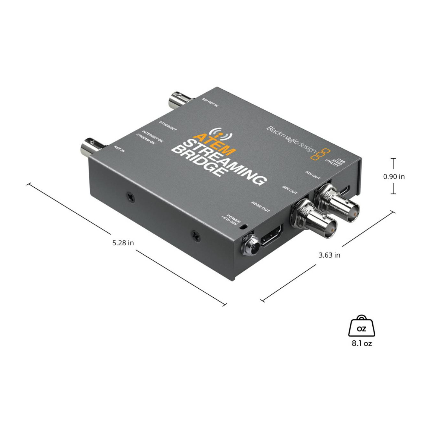 The ATEM Streaming Bridge is a powerful video converter designed for professional remote broadcasting and content collaboration. It allows you to receive an H.264 video stream from any ATEM Mini Pro and convert it back into SDI and HDMI outputs for use with professional broadcast equipment and monitors.