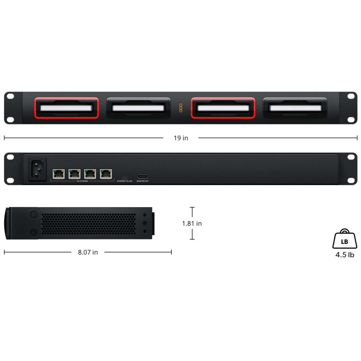 Equipped with four 10G Ethernet ports, it allows multiple editors or systems to access shared media simultaneously with minimal latency. In addition, an Ethernet-over-USB-C port offers added flexibility for configuration and network access, while global collaboration is enabled through Blackmagic Cloud synchronization and Amazon S3 sync.