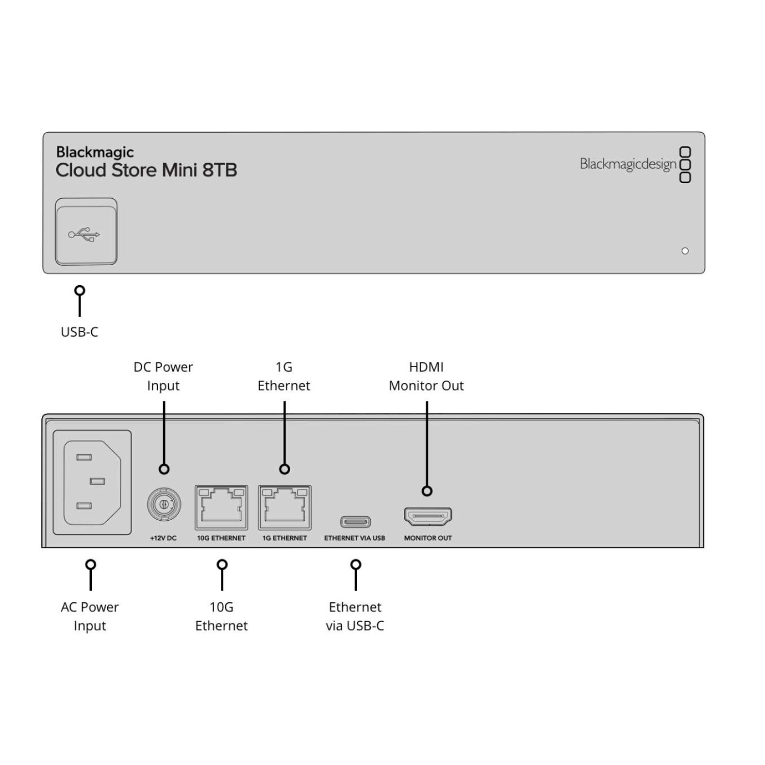 The Cloud Store Mini 8TB includes high-speed connectivity options ideal for collaborative media environments. It features 1 x 10G BASE-T Ethernet port supporting 100/1000/10G connections, and 1 x 1G Ethernet port for standard 100/1000 BASE-T network access. Additionally, a USB-C 3.0 port (up to 5Gb/s) is available, supporting Ethernet over USB for flexible configuration and updates. For monitoring, it includes 1 x HDMI output to connect a display.