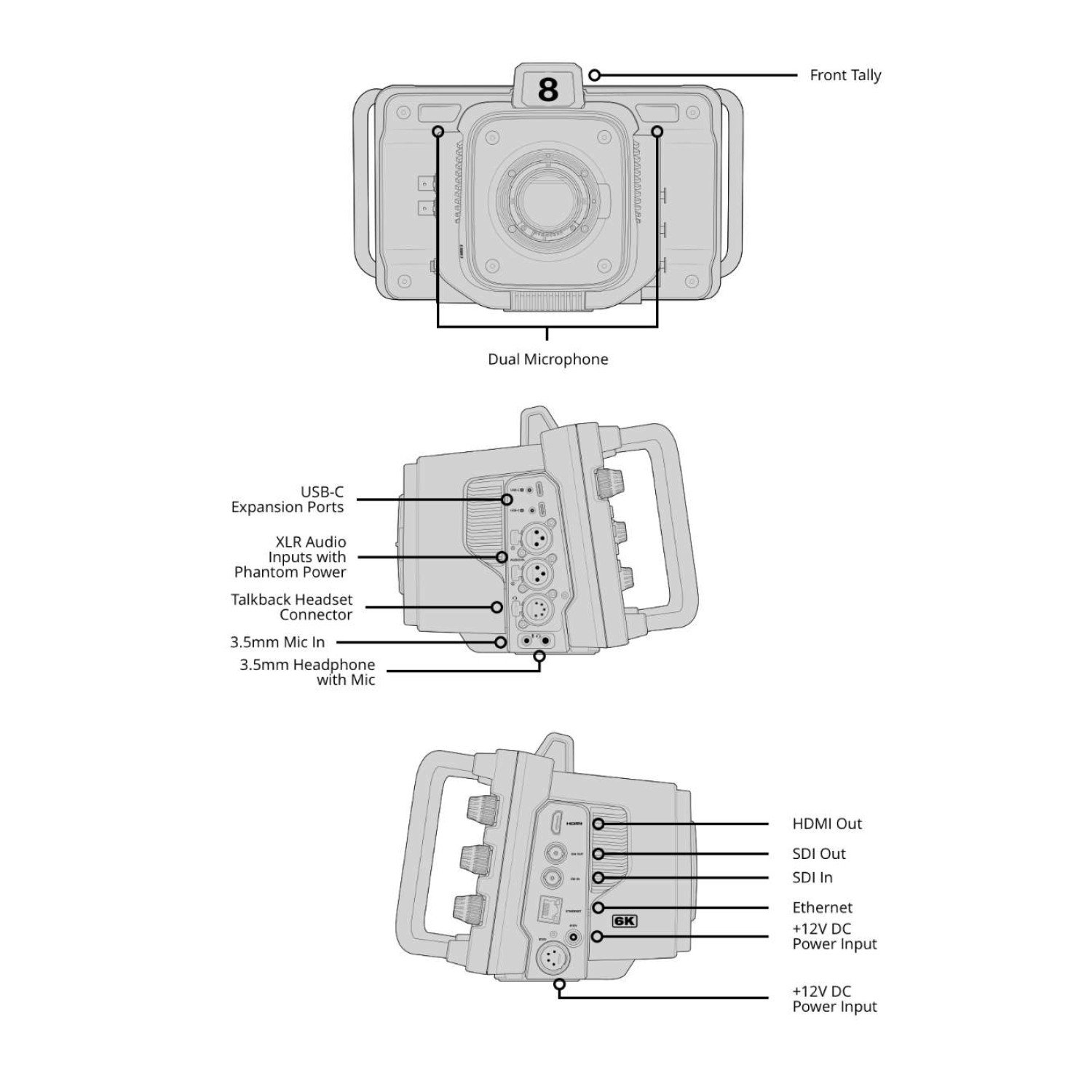 Connectivity includes 1 x SDI input and 1 x SDI output supporting 1.5G, 3G, 6G, and 12G rates, plus 1 x HDMI 2.0 output. Audio connections feature 2 x XLR inputs (switchable mic/line with phantom power), 1 x 3.5mm stereo input (also for timecode), 1 x 5-pin XLR for talkback, and 1 x 3.5mm TRRS headphone/mic jack. SDI outputs carry two channels of program audio and talkback on channels 15 and 16. Reference input is supported via Tri-Sync or Black Burst when using the optional Blackmagic Studio Converter. Network and computer connectivity include 10Gb/s Ethernet and dual USB Type-C 3.1 Gen 1 ports for recording, focus/zoom demands, and software updates.