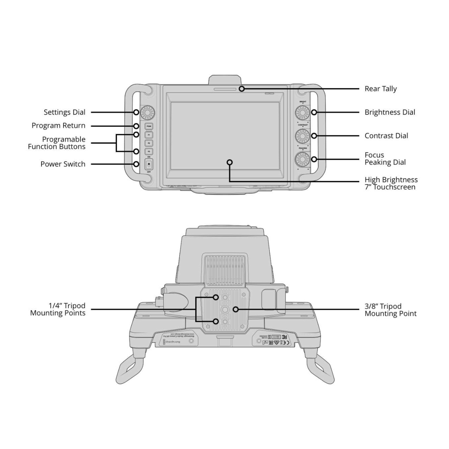 A 7-inch 1920 x 1200 LCD capacitive touchscreen with 2000 nits brightness provides clear monitoring. Physical controls include a rotary settings dial, program button, three customizable function buttons (F1-F3), and dedicated brightness, contrast, and peaking dials.