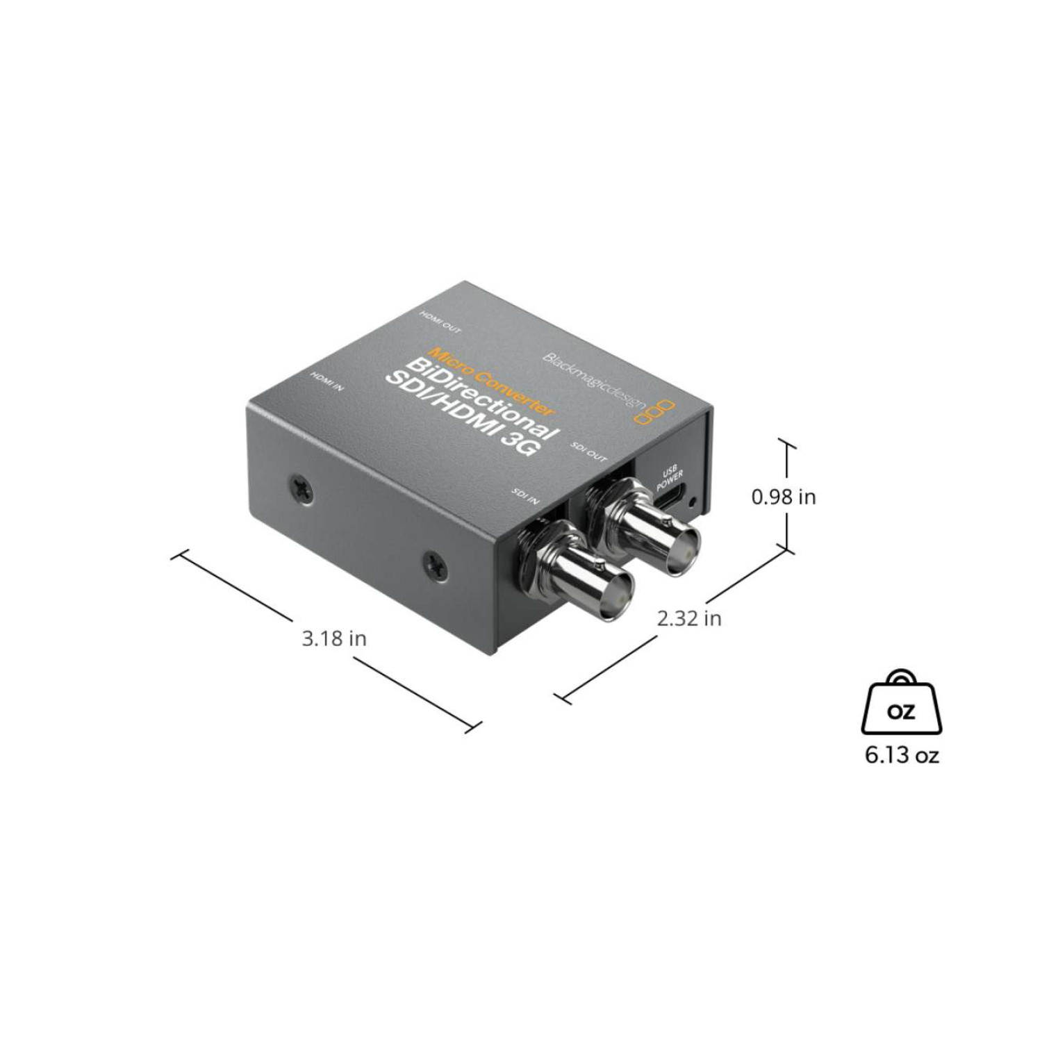 The Micro Converter BiDirectional SDI/HDMI 3G features 1 x SD, HD or 3G-SDI video input, with SDI video outputs that automatically match the HDMI input signal. It includes an HDMI Type A input and HDMI Type A output, ensuring versatile connectivity. The unit supports multi-rate operation with automatic detection of SD or HD formats, and it is equipped with a USB Type-C port for updates, configurations, and power. SDI reclocking is also supported for optimal signal integrity.