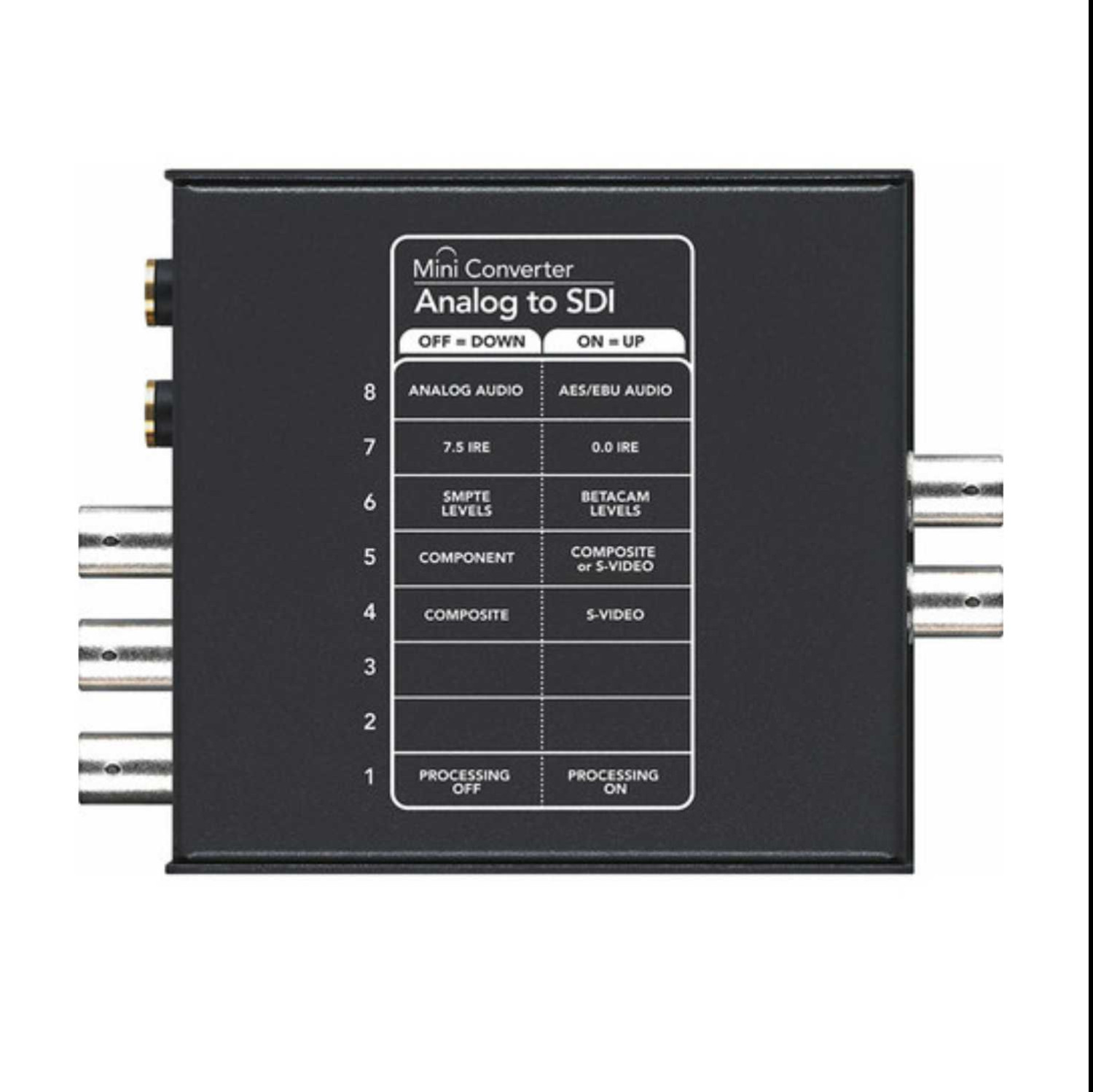 With Blackmagic Design's Mini Converters, it's as simple as using a pen to change settings. Settings vary between models, and include settings such as AES/EBU or analog audio, analog video connections, and more.
