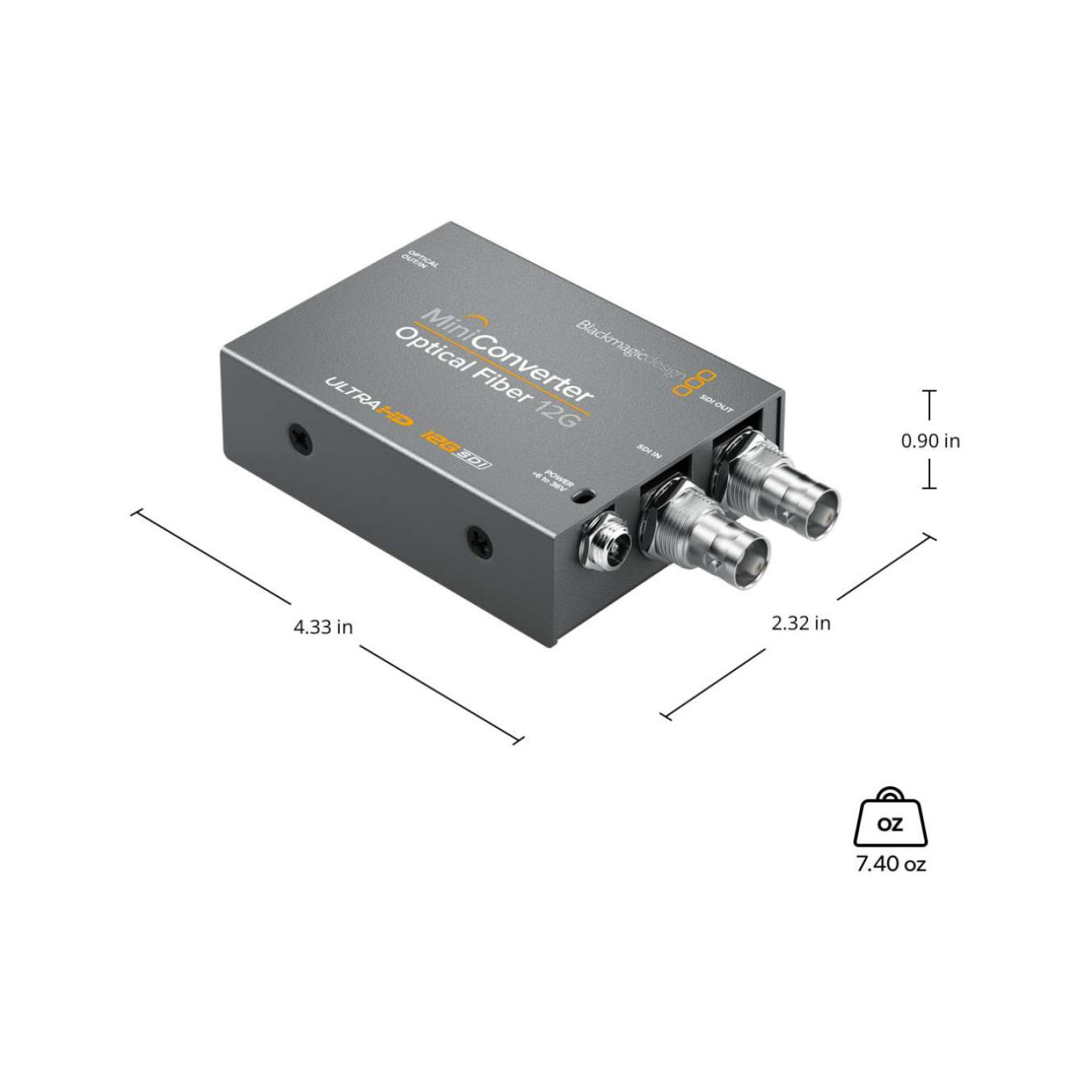 The Mini Converter Optical Fiber 12G features 1 SD, HD, or 12G-SDI video input and 1 optical fiber input. The SDI video output automatically matches the SD, HD, or 12G-SDI input on the optical fiber. It includes an optional SMPTE optical fiber SFP socket (SFP module sold separately). The optical fiber video input supports 10-bit SD/HD/12G-SDI switching, while the output automatically matches the video input format. Both optical fiber audio input and output support 16 channels of embedded audio. Multi-rate support allows automatic detection of SD, HD, or 12G-SDI, and reclocking is also supported for signal integrity.