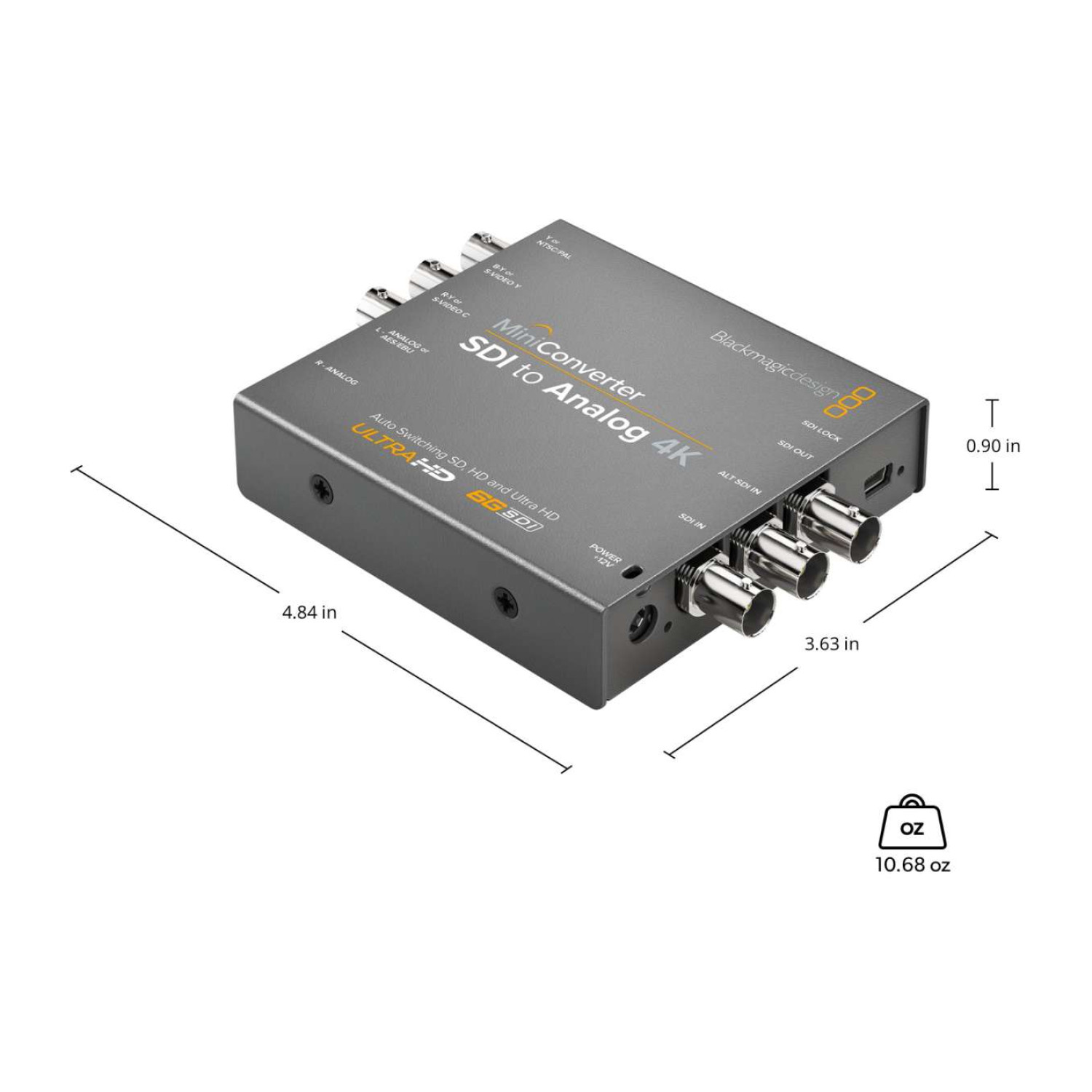 The Mini Converter SDI to Analog 4K features 1 x SD, HD, or 6G-SDI input along with 1 x ALT SDI input for automatic switchover in case the main input fails. It includes 1 x SDI loop output and supports analog video outputs in NTSC, PAL, S-Video, and component SD/HD formats derived from the 6G-SDI input. For audio, it offers 2 channels of professional balanced analog audio via standard 1/4-inch jacks and 2 channels of professional balanced digital audio with the same connection type. The SDI redundant input ensures uninterrupted operation by switching automatically if the main SDI signal is lost. Multi-rate support enables auto-detection of SD, HD, or 6G-SDI signals, and updates or configuration can be handled via USB. Reclocking is also supported for signal integrity.