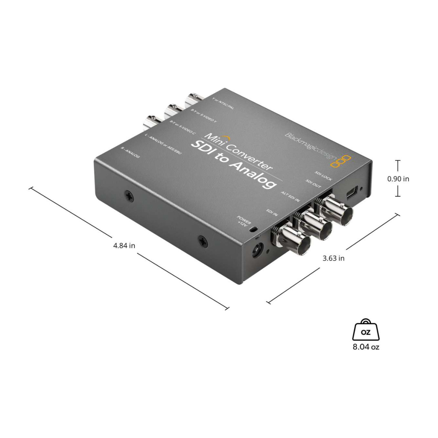 Each package includes the Mini Converter SDI to Analog unit, a 12V universal power supply with international socket adapters, and a 3-year limited manufacturer’s warranty.