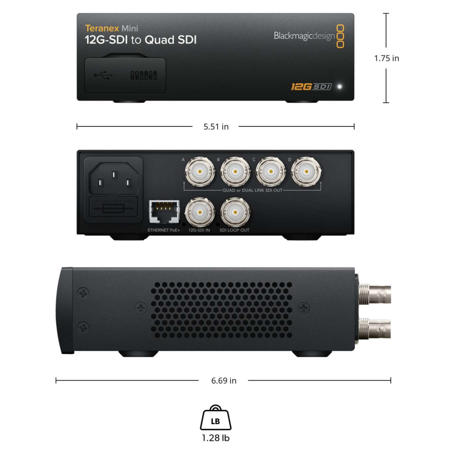 The Teranex Mini 12G-SDI to Quad SDI features a single 12G-SDI video input supporting SD, HD, 2K, and 4K formats with automatic switching. It provides four 3G-SDI outputs and one 12G-SDI loop output, along with embedded audio support for up to 16 channels. The device includes automatic multi-rate support for SD/HD/2K and 4K signals, ensuring compatibility with a wide range of formats. Updates and configuration can be carried out via USB or Ethernet, and the unit supports reclocking for optimal signal integrity.