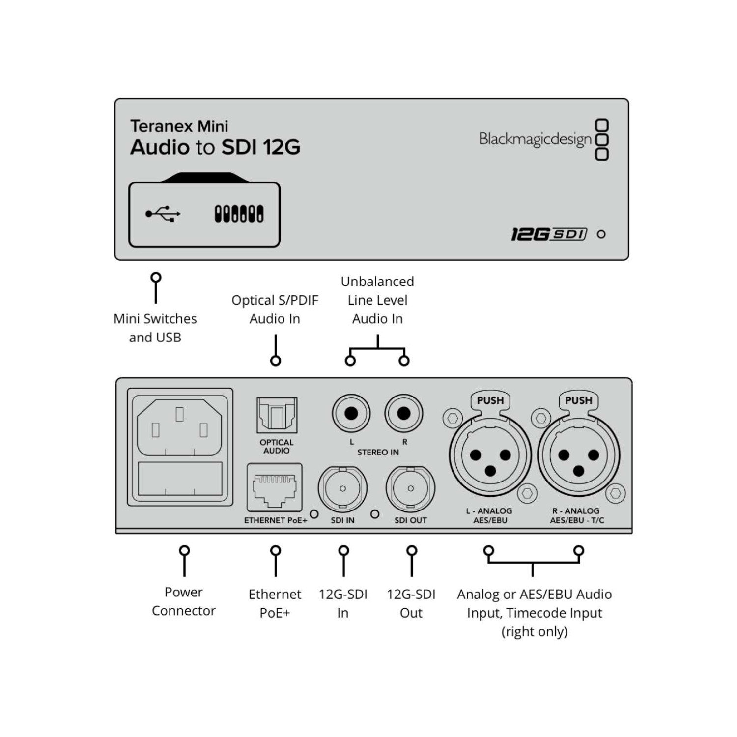 The Teranex Mini Audio to SDI 12G features 1 x 12G-SDI input with auto-switching for SD, HD, 2K, and 4K formats, along with 1 x 12G-SDI output for high-quality video signal pass-through. Analog audio inputs include 2 channels of professional balanced analog audio via XLR connectors, or 2 channels of unbalanced analog line-level audio via RCA connectors. The right XLR connector can be configured as a timecode input. Digital audio inputs support 4 channels of professional 110Ω balanced audio via XLR connectors, with the right XLR also configurable for timecode. An optical audio input is available for S/PDIF signals via a TOSLINK connector. The unit supports up to 16 channels of embedded audio. Multi-rate support allows automatic switching between SD, HD, 2K, and 4K formats. Updates and configuration can be performed via USB or Ethernet, and the unit includes SDI reclocking for optimal signal integrity.