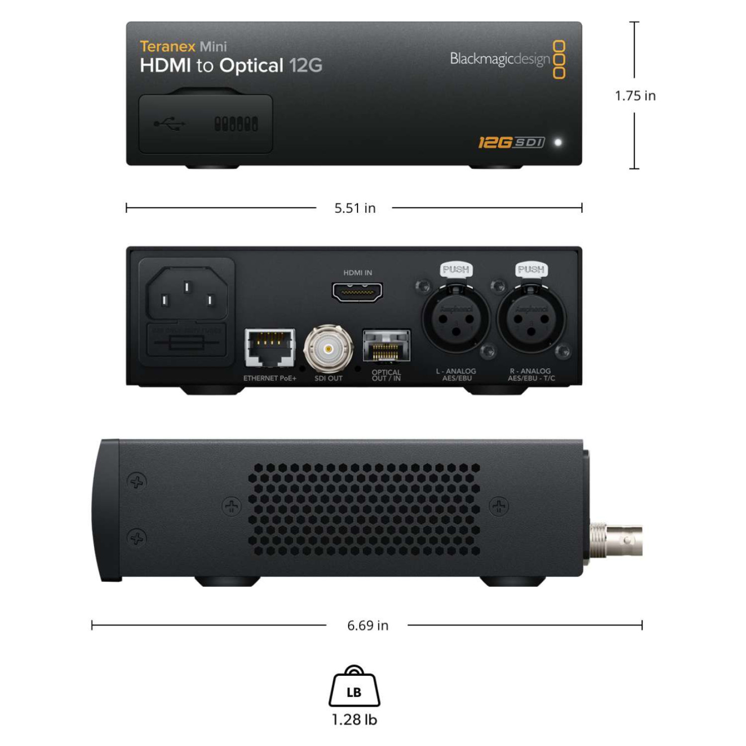 The Teranex Mini HDMI to Optical 12G features versatile connectivity options, including an optional 3G/6G/12G Optical SFP input and a single 12G-SDI output. It supports one HDMI 2.0 type A input connector with resolutions up to 2160p60. For optical fiber, there is an optional 3G/6G/12G Optical SFP output that automatically matches the SD, HD, and 12G-SDI HDMI video input. Audio connectivity includes two channels of professional balanced analog audio via XLR connectors, with the right XLR configurable for timecode input, and four channels of professional 110Ω balanced digital audio via XLR connectors, with the right XLR also configurable for timecode input. Embedded audio support allows for up to 16 channels.