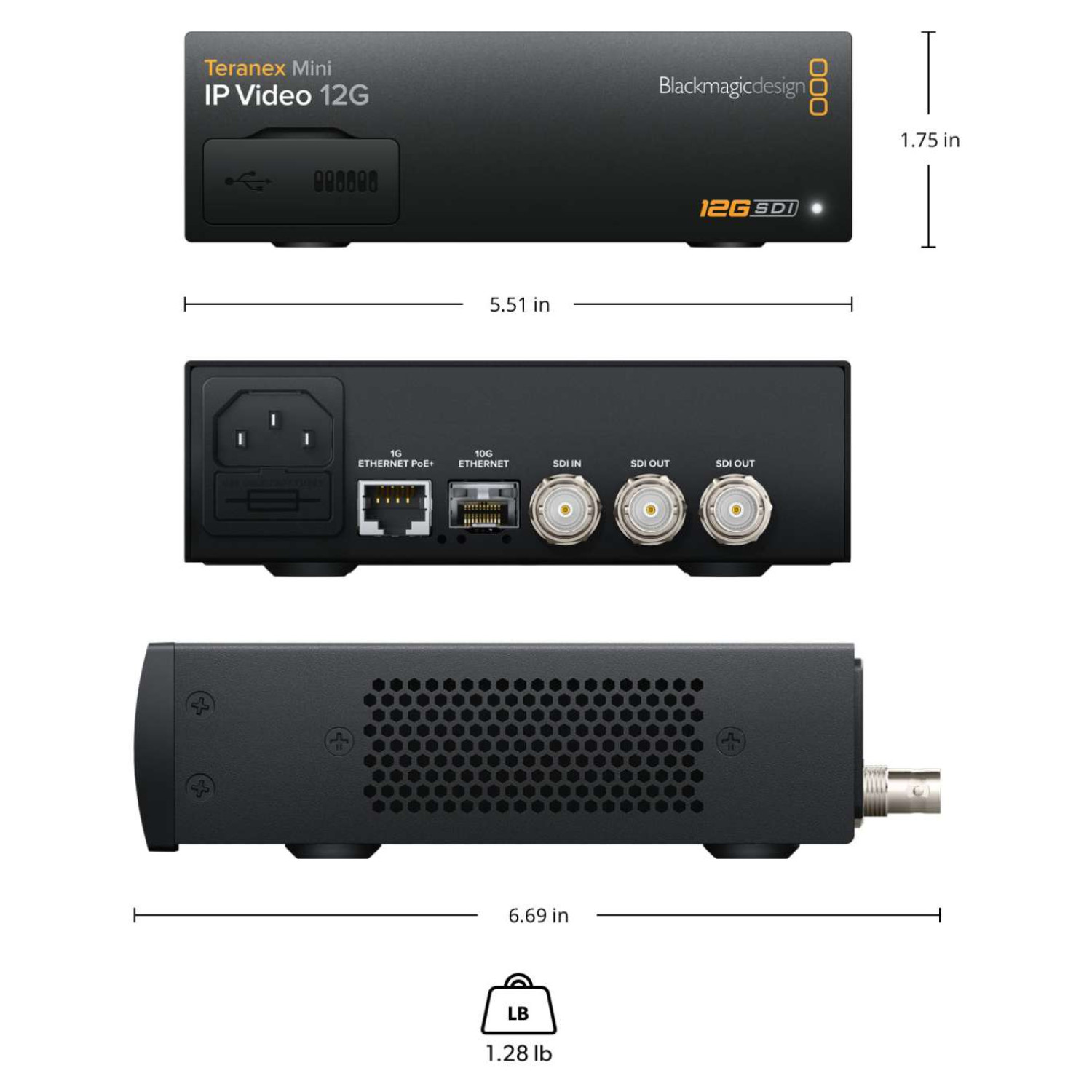 The Teranex Mini IP Video 12G features one 10-bit SDI video input supporting HD-SDI, 6G-SDI, and 12G-SDI formats. It provides two 10-bit SDI video outputs with the same format compatibility. For network connectivity, a Gigabit Ethernet port supports 3G-SDI up to 1080p60 using TICO encoding and decoding, while an optional 10G optical data Ethernet interface supports Ultra HD up to 2160p60 with TICO encoding and decoding. The device supports multi-rate operation with automatic detection of HD-SDI, 6G-SDI, or 12G-SDI. Firmware updates and IP configuration can be performed via USB 2.0 (high-speed 480Mb/s) or Ethernet. All SDI outputs feature reclocking with auto-switching between HD, 6G-SDI, and 12G-SDI video formats.