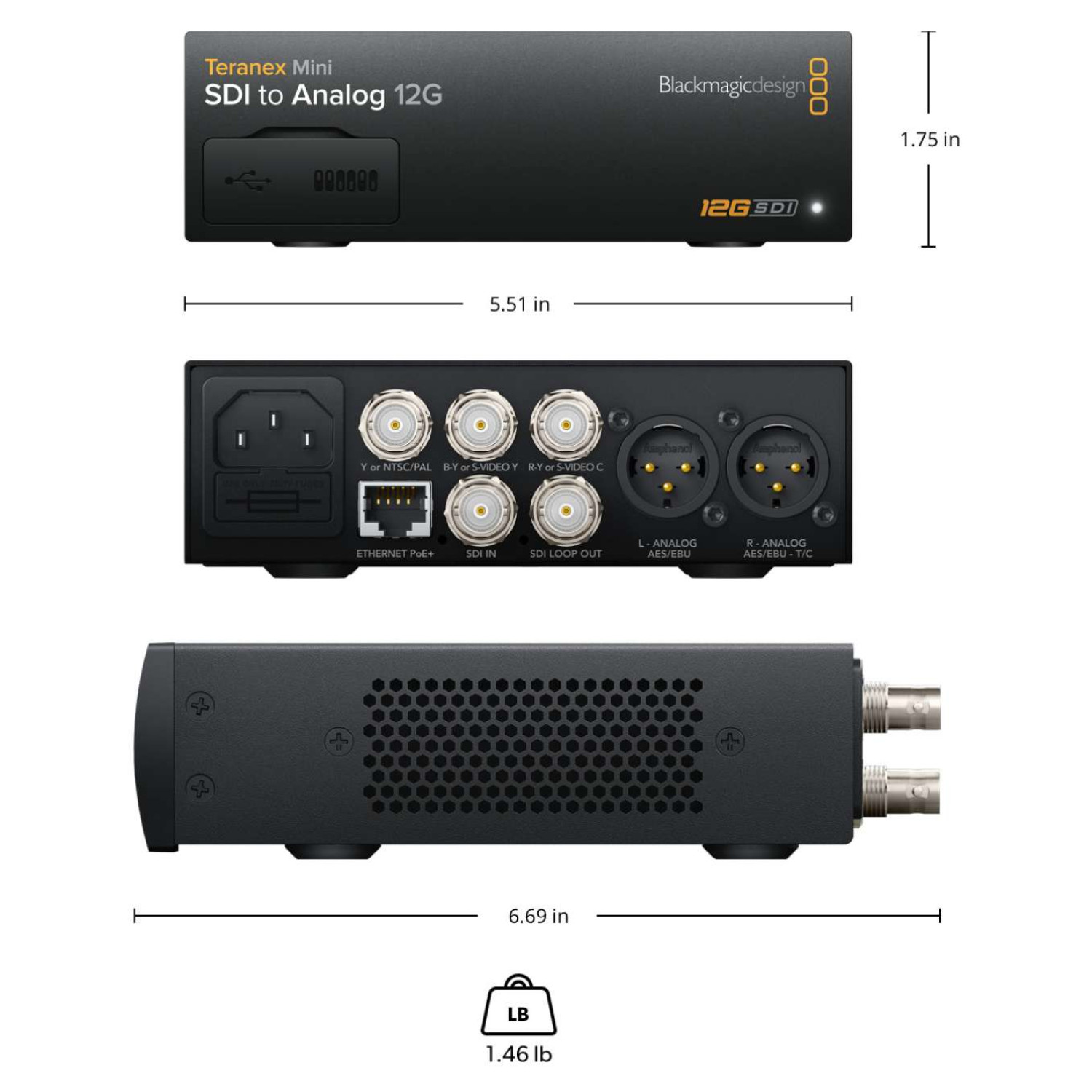 The Teranex Mini SDI to Analog 12G features a single 12G-SDI input with SD, HD, 2K, and 4K auto-switching capabilities, alongside a 12G-SDI loop output for signal pass-through. For analog video, it offers outputs in composite, Y/C, or component formats, ensuring compatibility with a wide range of legacy equipment. Audio connectivity includes two channels of professional balanced analog audio via XLR connectors, with the right XLR configurable for timecode output. Additionally, it supports four channels of professional balanced digital audio (110Ω) via XLR connectors, also allowing the right channel to be set for timecode. The converter supports 16 channels of embedded audio and automatically switches between SD, HD, 2K, and 4K signals. Updates and configuration can be handled via USB or Ethernet, and the device includes SDI reclocking for signal integrity.